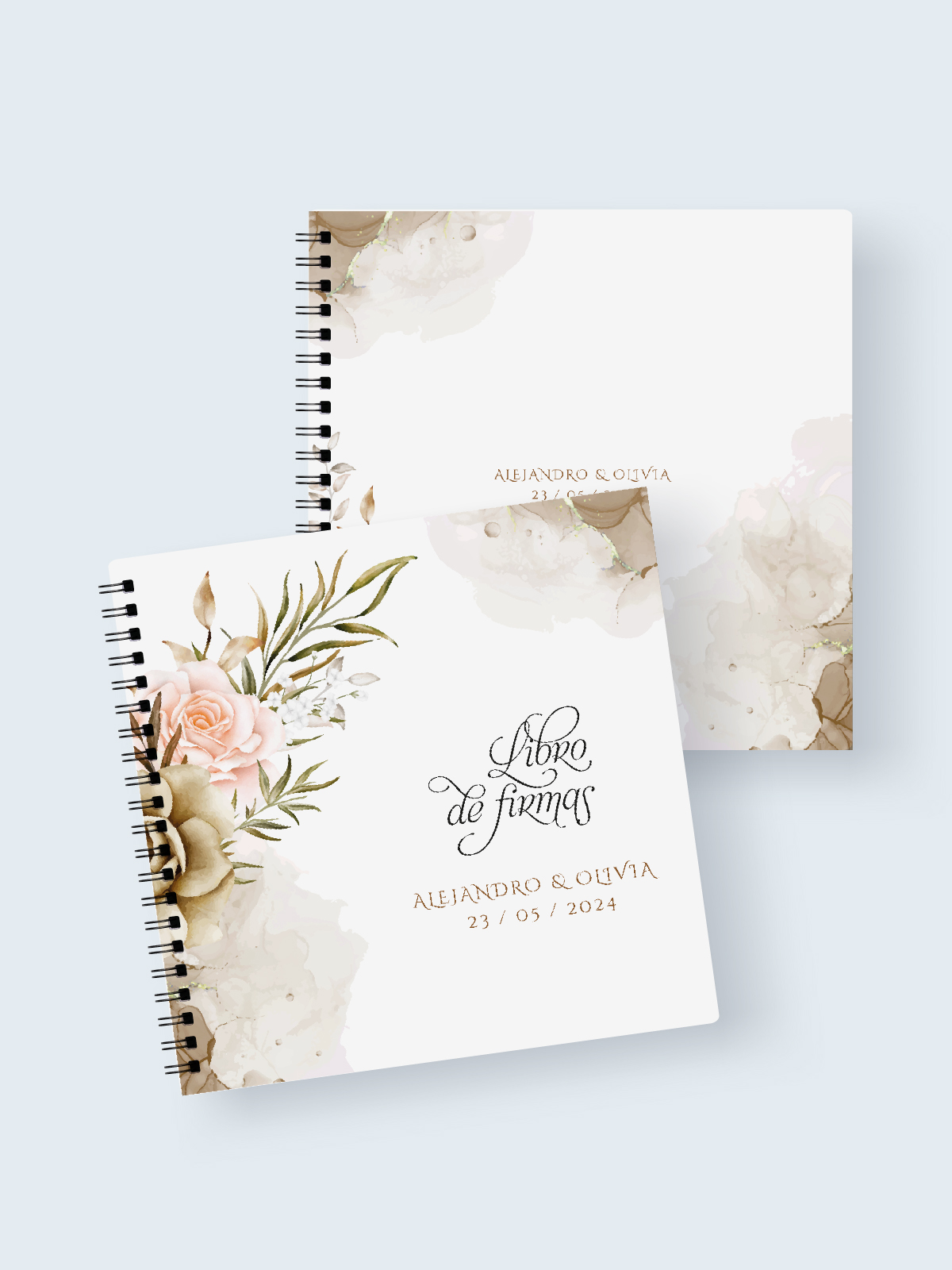 Libro de firmas Flor acuarela es un álbum encuadernado en wire-o. ¿Quieres recordar todos los momentos vividos de tu boda? Pues este libro de firmas es perfecto para ti. En él puedes guardar todos esos recuerdos que pasaron en ese día especial. Revive cada momento: invitados, risas, los comentarios de los invitados, dibujos, dedicatorias…