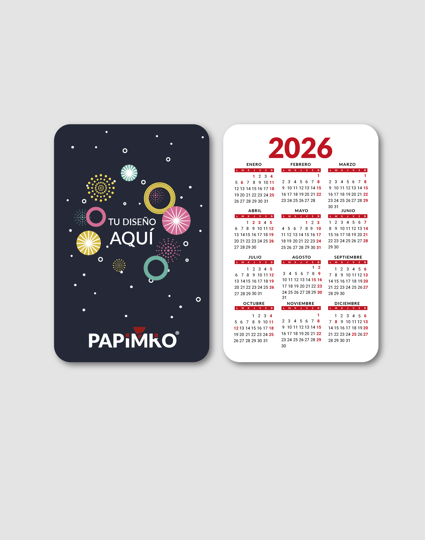 Crea tus calendario de bolsillo personalizado con tu foto, logo o texto, personalizando el 100 % de la cara que no contiene los meses del año. Los calendarios contienen los festivos anuales del año y domingos resaltados. No incluye los festivos autonómicos ni festivos locales.