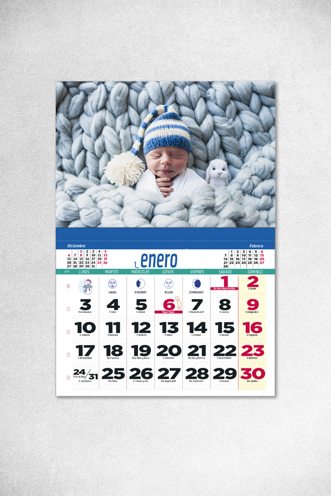 Calendario faldilla personalizado con tu fotografía o con el logo de tu empresa. El tradicional calendario de faldilla con tu toque personal. Puedes personalizarlo con la foto de un nuevo miembro de la familia, la fotografía de un evento importante… Aunque también puedes utilizarlo como reclamo publicitario en tu empresa. Sólo tienes que poner tu logo y los datos o una fotografía mostrando tus productos. Tus clientes verán tu publicidad durante todo el año.