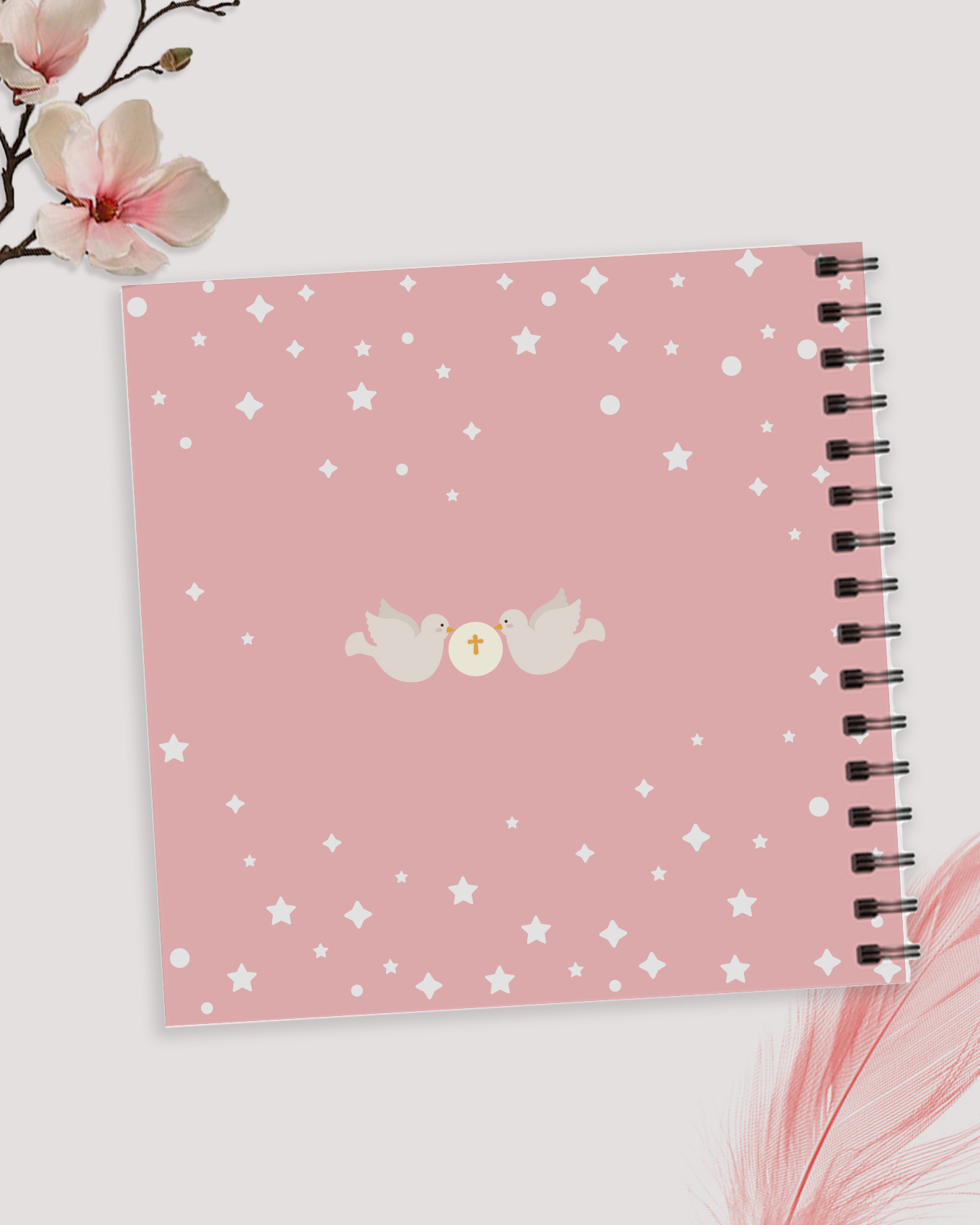Tiene un tamaño de 20 cm x 20 cm. Su portada, que puedes personalizar con el nombre y la fecha de ese día, es de tapa dura impresa en papel estucado de 300 gr. El interior contiene 25 páginas impresas por ambas caras en cartulina reciclada 250 gr, las que puedes destinar a las firmas de tus invitados o decorar con fotografías impresas. La encuadernación es de wire-o, lo que hace muy fácil pasar las páginas.