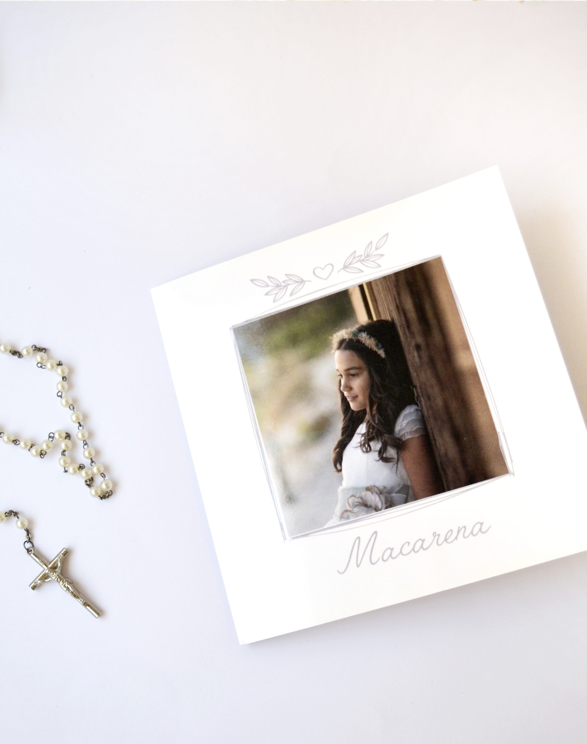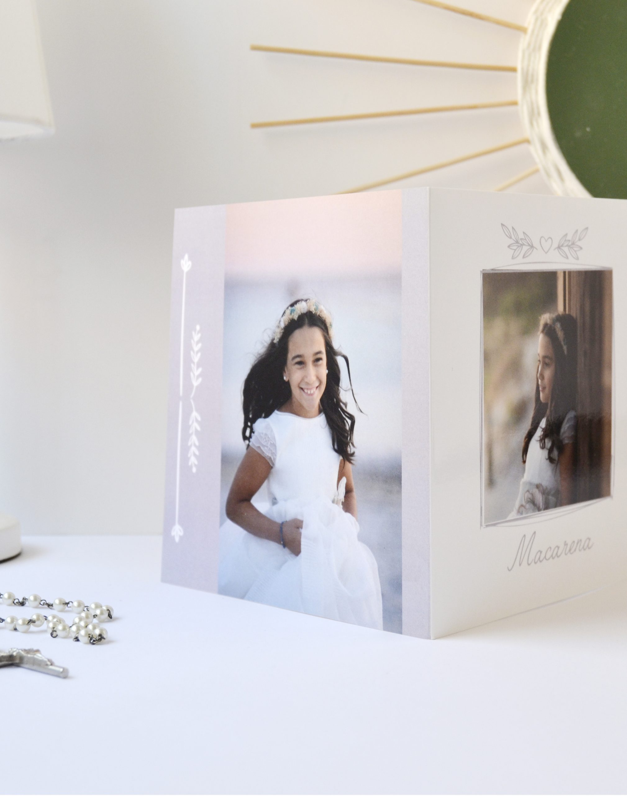 El número máximo de fotografías que puedes añadir es de 4, las cuales se colocarán una en cada cara del díptico impreso por delante y por detrás. Además podemos personalizarlo con el nombre y la fecha, que se imprimiría sobre la portada. Este recordatorio de comunión personalizado es el más utilizado para regalar un detalle a familiares y amigos.