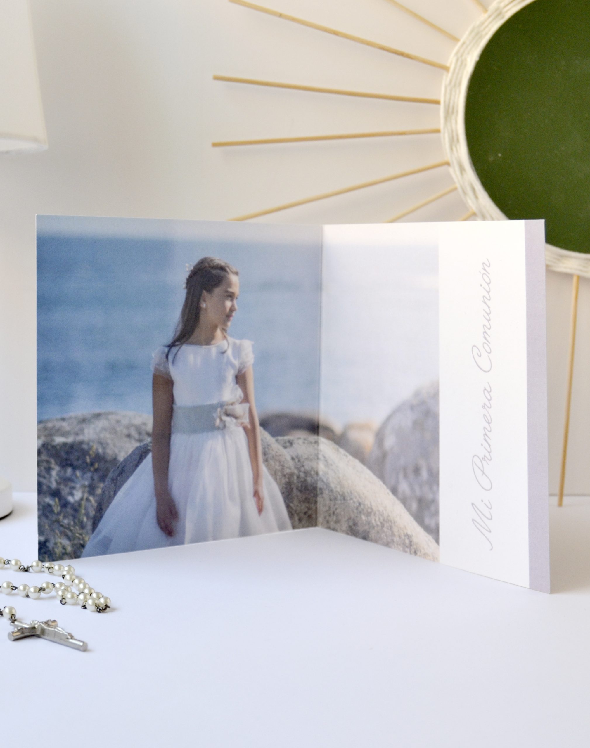 El recordatorio comunión personalizado preferido para imprimir las mejores fotos de tu comunión. Impreso sobre papel de 200 gr. con dos acabados a elegir: acabado mate o brillo. Tiene unas dimensiones de 30 cm de largo por 15 cm de alto cuando está abierto; y de 15 cm x 15 cm cuando lo vemos cerrado. Su tamaño es perfecto para entregar en un sobre cuadrado o en una bolsita transparente. Tus invitados y familiares quedarán encantados.
