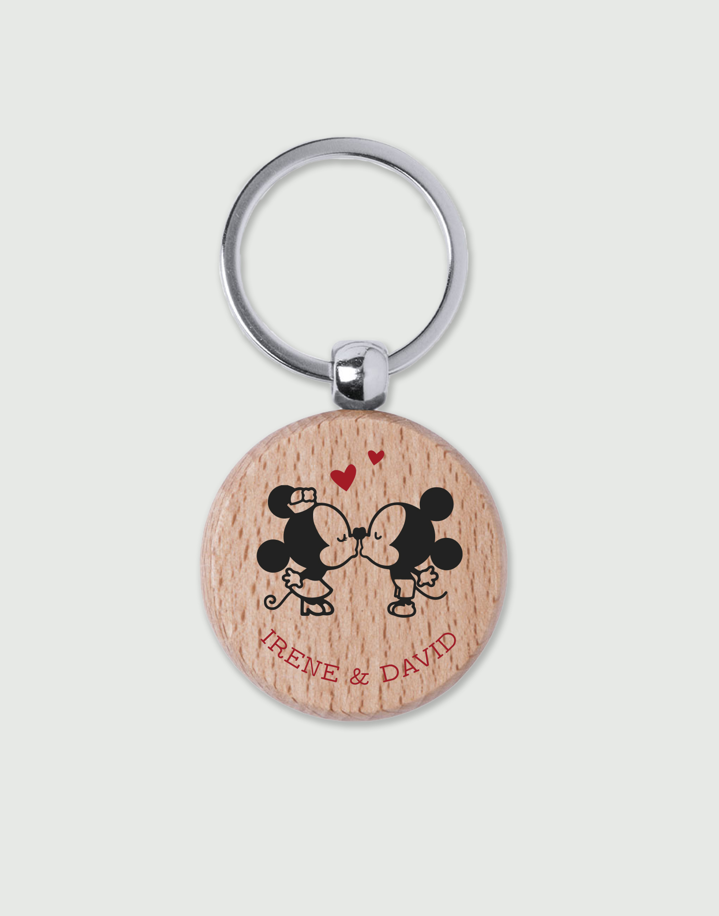 LLavero de madera personalizado con Minnie y Mickey y con vuestros nombres. Este divertido llavero es un detalle perfecto para regalar a tu pareja en el día de los enamorados, en una fecha especial como vuestro aniversario, San Valentín o simplemente por que quieres demostrar tu amor.