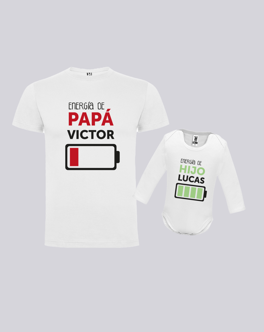Pack energía es un conjunto de camiseta de hombre de manga corta y de body de manga larga impresos a todo color. Es un regalo original y sorprendente para el día del padre, para padres primerizos, cumpleaños, amigos invisibles… La camiseta de manga corta está fabricada en 100% algodón. Con un cuello redondo de 4 capas en canalé 1×1 con cubrecosturas de hombro a hombro. Y con costuras laterales. La impresión está disponible en dos tamaños: 30×40 y 20×30. Dependiendo la talla que elijas, es recomendable elegir un tamaño de impresión mayor si la talla es más grande. Body de bebé es de manga larga de punto liso con el cuello redondo y bajo ribeteado en canalé 1×1. Tiene cierre con botones a presión en la entrepierna y el hombro es de apertura cruzada. La impresión se realiza en serigrafía digital, un método novedoso de impresión. Es resistente a lavados, sin embargo es recomendable lavar del revés la prenda para que la impresión no roce con el tambor de la lavadora y pueda rallarse o estropearse. La temperatura recomendada de lavado es inferior a 30º. Y para una mejor conservación también es recomendable que se planche del revés. Sorprende a papá en su día demostrándole tu cariño con un diseño especial para él. Tenemos disponibles más modelos en nuestra web para elegir. El día del padre que nunca olvidará. Podrás personalizarla con su nombre, que irá impreso justo debajo de la ilustración.